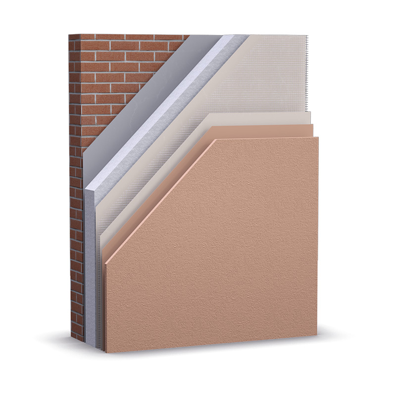Sistema de aislamiento térmico por el exterior de altas prestaciones basado en el uso de un mortero polimérico en pasta libre de cemento para el tendido sobre los paneles aislantes.